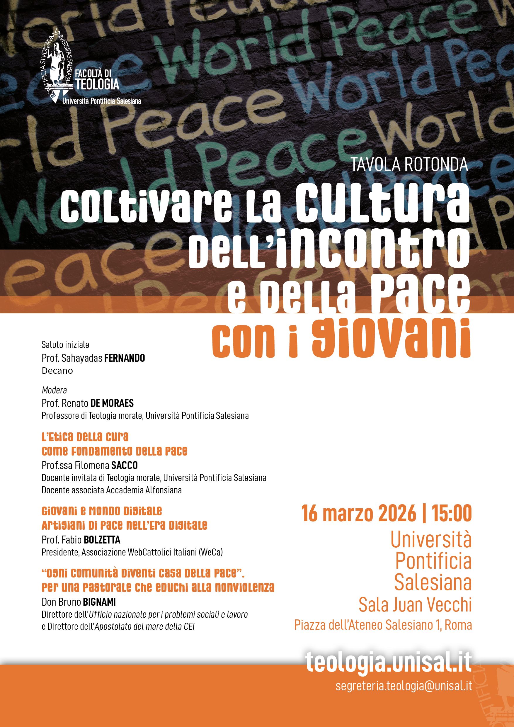 Coltivare la cultura dell’incontro e della pace con i giovaniLa Tavola rotonda, organizzata dalla Facoltà di Teologia, propone un momento di riflessione multidisciplinare sui temi più urgenti dell’attualità, in un contesto segnato da conflitti, crisi comunicative e sfide digitali. L’incontro approfondirà il ruolo dell’etica della cura come fondamento di una cultura dell’incontro e della pace, con particolare attenzione ai giovani e alle nuove forme di comunicazione. Sala Juan Vecchi 15:00 - 17:00 |