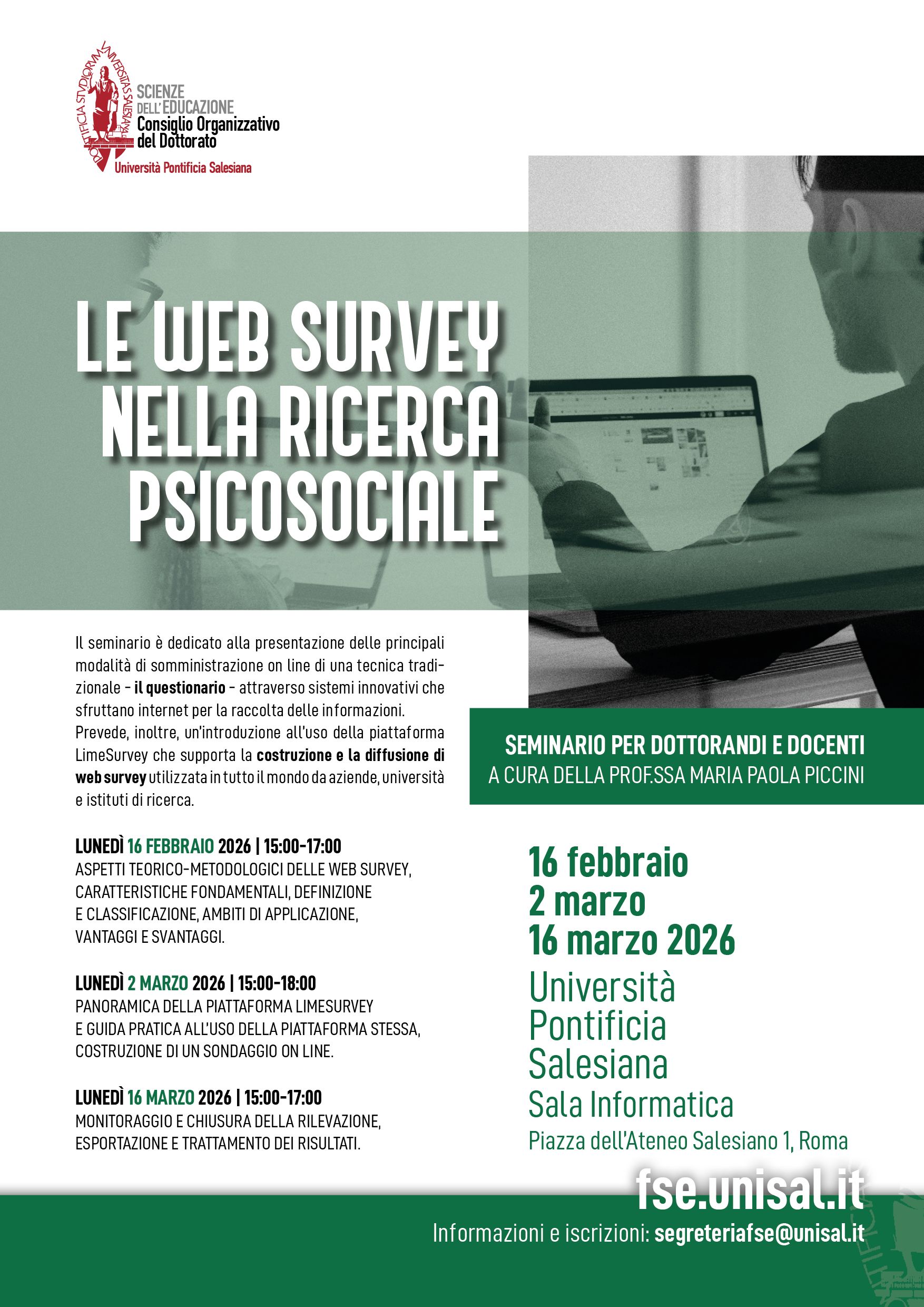Le web survey nella Ricerca Psicosociale - Terza giornataSeminario per docenti e dottorandi, promosso dalla Facoltà di Scienze dell'Educazione, che analizza la trasformazione della ricerca psicosociale nella web society, presentando vantaggi e limiti della somministrazione online dei questionari e introducendo l’uso della piattaforma LimeSurvey per la realizzazione di web survey. Sala informatica 15:00 - 17:00 |