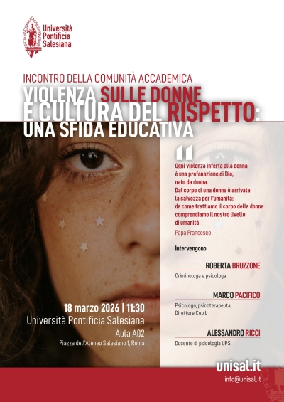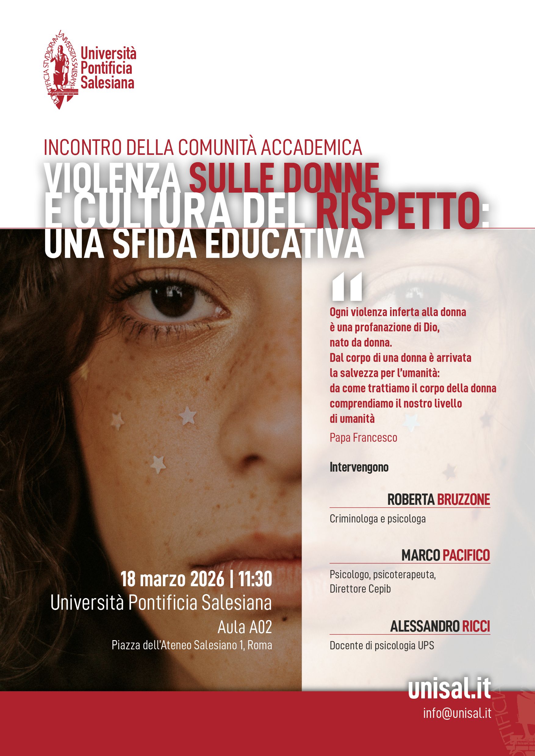 Incontro della Comunità Accademica: Violenza sulle donne e cultura del rispettoIntervengono Roberta Bruzzone, criminologa e psicologa, Marco Pacifico, psicologo, psicoterapeuta e direttore Cepib, e prof. Alessandro Ricci, docente di psicologia presso l'UPS. Aula A02 11:30 |