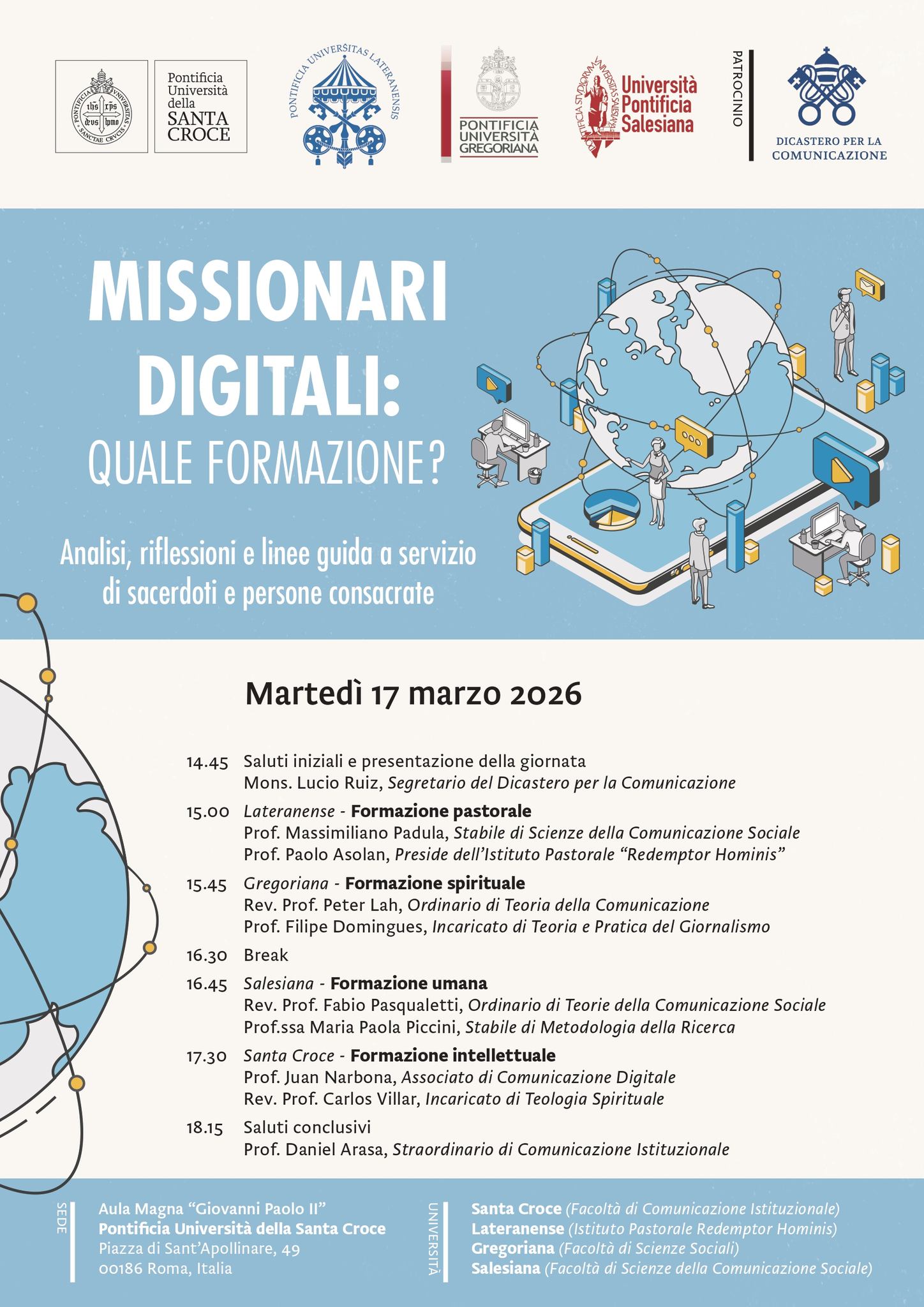 Missionari digitali: quale formazione?Incontro inter-universitario organizzato dalle Università Pontificie Santa Croce, Lateranense, Salesiana e Gregoriana, con il patrocinio del Dicastero per la Comunicazione della Santa Sede, volto a promuovere una riflessione e a offrire alcune linee guida per sacerdoti e persone consacrate che operano nei social media. Pontificia Università della Santa Croce 14:40 |