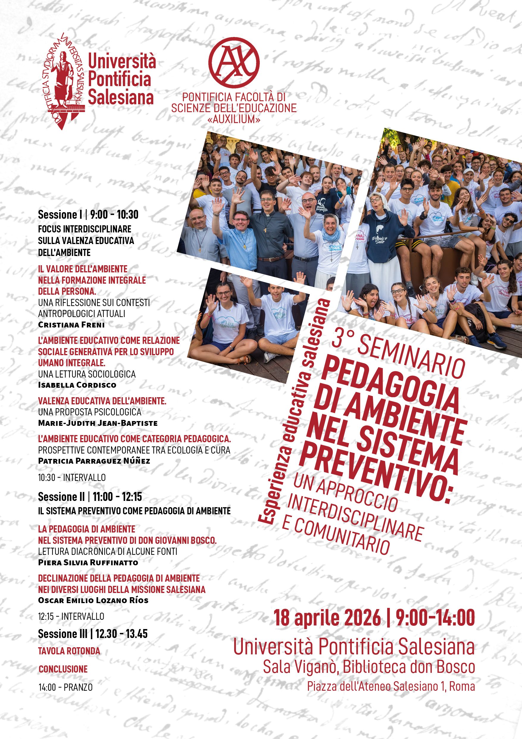 Esperienza Educativa Salesiana - 3° SeminarioIl terzo seminario, dal titolo Pedagogia di ambiente nel Sistema Preventivo: un approccio interdisciplinare e comunitario, è riservato a docenti e dottorandi dell’Università Pontificia Salesiana, della Pontificia Facoltà di Scienze dell'Educazione Auxilium e dei Centri Collegati. Sala Viganò, Biblioteca Don Bosco 9:00 - 14:00 |