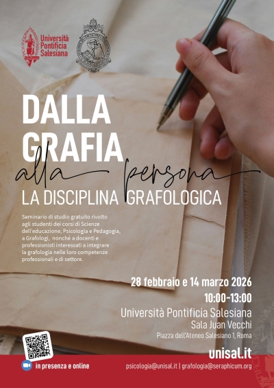 Dalla grafia alla persona: la disciplina grafologicaPrimo appuntamento del seminario di studio realizzato in collaborazione con la Scuola di Grafologia "Seraphicum", dedicato all’approfondimento della grafologia come strumento di conoscenza della persona. L’incontro è rivolto agli studenti dei corsi di Scienze dell’Educazione, Psicologia e Pedagogia, nonché a docenti e professionisti interessati a integrare la grafologia nelle proprie competenze educative, psicologiche e formative. Sala Juan Vecchi 15:00 - 18:00 |