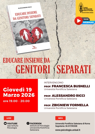 Webinar: Educare insieme da genitori separatiL'Istituto di Psicologia promuove un webinar gratuito dedicato al tema della co-genitorialità dopo la separazione, con l’obiettivo di riflettere su come ridefinire la relazione genitoriale e costruire una collaborazione educativa efficace. L’incontro offrirà spunti teorici e indicazioni pratiche per tutelare il benessere dei figli, valorizzando il dialogo e la responsabilità condivisa tra i genitori. L’evento è aperto a tutti e sarà trasmesso in diretta sul canale YouTube dell’Istituto, al link dedicato. Online 19:00 - 20:00 |